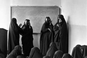 Tehran, Iran: A classroom in a mosque with a group of Basiji (Mobilized volunteer forces) women in black chadors and gas masks on their heads by hte blackboard, learning how to use them in case of a chemical warfare attack by Saddam Hussein on Tehran. Towards the end of eight year long Iran-Iraq war the threat of Iraq’s use of chemical weapons were getting more likely as days went by. (Photo by Kaveh Kazemi/Getty Images)